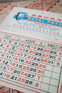 実はここではババ・カレンダーを毎年刷って売っています。ババ・カレンダーとはマレー語と英語で中国式カレンダーと西洋式カレンダーを合体させたもの。実は見ずらくて機能的ではないんですが、私はその渋いデザインに一目惚れ。
