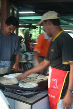 食べたのはマレーの人たちが作るロティ・チャナイ。これは本来インド系の食べ物です。シンガポールではロティ・プラタと呼んでいます。パイ生地に似たものを回して回してうす〜く伸ばし、最後にそれを小さな丸形にまとめて鉄板で焼き上げます。