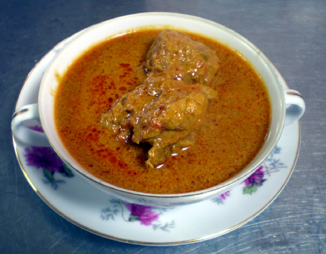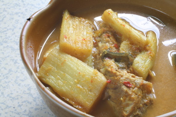 そして海峡植民地のプラナカンとの関係を強く感じさせる料理、Gaeng Som。マラッカやシンガポールでいうAsam Pedas、ペナンの Asam Gulaiに酷似する料理です。でも、発祥はおそらくこちらタイなのでは。タマリンドをベースとした酸味のある汁っぽい魚のカリー系の料理です。もちろんとても美味しいですが辛みは強いですね。写真の左手に映っている白っぽい物体は、蕗のオバケのような野菜の茎です。しゃきしゃきとしておいしい