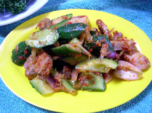 きゅうりが美味しい季節にもってこいの「サンバル・ティムーン」は、水々しく歯ごたえ抜群のきゅうりに、塩漬けした豚のほどよいこってり感とスパイシーなチリと蝦味のブラチャンがからみあった、風味抜群のサラダでした。