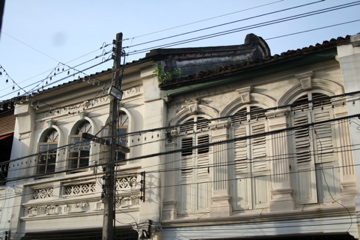 街中央のタラン・ロードやディブック・ロードなどはマラッカのヒーレン・ストリートのような通りなのです。この周辺はペナンやシンガポールでよく見られるようなプラナカン様式(Straits Chinese Style)のショップハウスやテラスハウスがずらりと並んでいます。しかしタイではこれを「Sino Portuguese Style」と呼んでいます。私はプラニー先生に「これをポルトガル様式と呼ぶのはおかしい。あきらかにStraits Chinese Styleだ」と言うと、「バンコクの建築家が勝手にSino Portugueseって名付けてそれが定着してしまった。その建築家のワイフはマカオ出身だからね、ポルトガル式だって言い張ってんのよ」と。プーケットにある建築様式はあきらかにペナンから輸入されたものであり、オランダ後期からイギリス時代のスタイルでポルトガルは関係ありません。たしかにタイにポルトガル人がいた時代もありますが、プーケットではポルトガル時代の建物はほとんどビルマ侵攻時に破壊されたのだそうです。