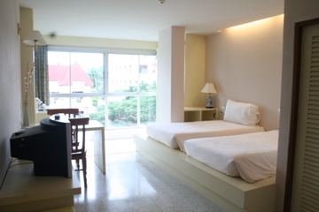 私が泊まった部屋は広めのBeijingというタイプの部屋で、このタイプには簡易キッチンもついていますが、食器と流し台、電気ポットがあるだけ。リク エストすれば電子レンジも入れてくれるとのことでしたが、外にいくらでも安くておいしい食べ物があるタイで自炊はアホらしいと考える私は頼みませんでし た。