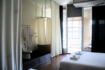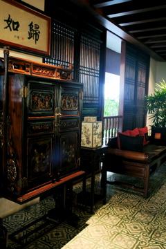 雰囲気のあるファサードの向こうには天蓋付きのベッド、ベッドルームの向こう側は屋内バスルームになっており、その先に光の差し込む半オープンエアーの シャワーが。シンガポールの5つ星ホテルにも見劣りしないセンス溢れる客室で、ちょっと贅沢したい人にぴったりです。なお、このホテルは今増築中で、既存 のSino Wingの他にSerene Wingと新しいロビーを作っています。このロビーはプーケットタウンにもよく見られるコロニアル・ヴィラを再現するのだそうです。ニューウイングの方の 客室はちょっとシノワズリーだけどかなりモダンなデザインになります。このホテルの客室は、デラックス以外は、かなり広い造りになっています。