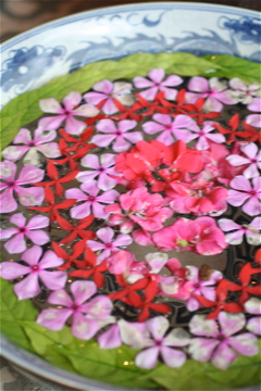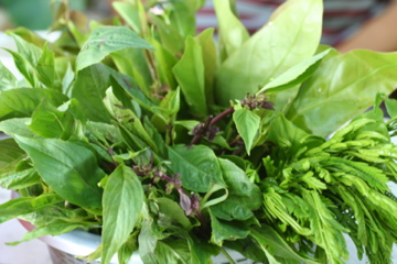 かなり珍しい薬草・野草が食卓にいっぱい並ぶのが印象的でした。「これは甘みがあってね、これは香りがいい」とかいろいろ薦められるのですが、結構渋いのもあって「ホントにこれ食用か?」と思うこともたびたび。とくにびっくりしたのは水草。タイ人でもよそから来た人は「これは水牛の餌じゃないか!」といって嫌がるそうで、よく見ると、金魚鉢に入ってそうなものも・・・。