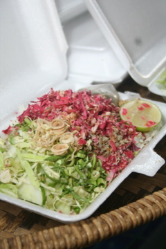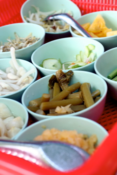シンガポールのラクサによく似たココナッツ系カリー味スープは熱めですが、麺(ビーフン)は冷たいので、つけ麺感覚的な一品です。このままでも十分おいしいですが、たいていずらりと野菜の小皿が並び、それを加えながら食べてもよいのです。小皿には、酢漬けになっているニンニクやら蕗のような野菜、キャムチャイ(中国南部でよく食べる酸味のあるカラシナ系漬け物)、干し魚、もやし、きゅうりなどさまざまです。私がハマったのは豆もやしの酢漬け。食べ出したら止まらなくなってしまうほどでした。聞くところによると、タイのプリンセスもプーケットに来るとこの豆もやしがお気に入りなんだそうです。この他にも薬草の詰め合わせがドカーンと来ます。麺を食べているというより、だんだん麺入りの生野菜を食べている、という感覚になりました。でも野菜を加える加減は人それぞれのようで、あまり野菜も加えずに食べている人もいました。