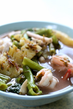 タマリンドを効かせた酸味のあるスープで、エビやイカの甘みがスープに移り、シャキシャキと歯ごたえのよい野菜がたっぷり入っています。