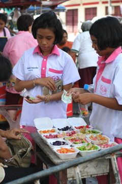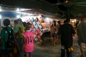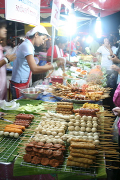 さて、外側の通りに並んだ屋台ではプーケットで一番美味しかったヤキトリがおすすめです。タイならではのスイーツ、ルークチュップ(果物などに似せて作ったちっちゃなお菓子で、一見固いキャンディーのようですが、中身はソフトで緑豆の餡が入っているもの。シンガポールでは数粒で3ドルと高いのですが、ここではなんと1粒1バーツ。1ドルで23粒も買える、ということです)を売るおばさんもいて、近所の学校の子どもたちが群がってました。