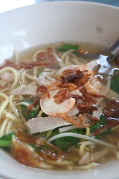 次にプーケット式ホッケン・プローン・ミー、えびそば。先生はペナンのよりもおいしい、と言っていましたが、私はペナンのには負けるんじゃ?と思いつつも、さっぱりと優しい味で子供にも食べやすいスープ麺です。太くて黄色い福建麺とエビ風味のスープです。ホッケンミーというと炒めホッケンミーもあるそうです。これはシンガポールやマレーシアの福建料理レストランなどで出す黒っぽいスタイルのようで、ちょっと違うのは上にとろとろ半熟卵をのせること。これ、日本人にはたまらないのではないでしょうか。