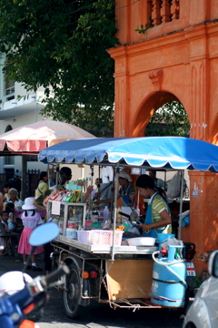 写真左)お気に入りの屋台街。プーケット在住の人ならこの写真でわかるかな?コロニアル建築のファサードの遺構が目印です。