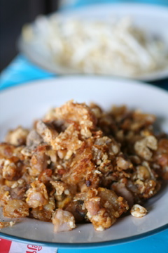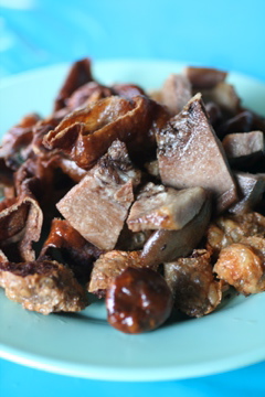 個人的に一番のお気に入りは、プーケット式ローバッLor Bak。ローバッとは肉巻きを福建語読みしたもので、豚ひき肉などを湯葉で巻いて揚げたものですが、ペナンあたりではこの肉巻きに厚揚げ豆腐やらエビのかき揚げやら揚げ物数種を盛り合わせ売るのが普通で、これをひとまとめにローバッと呼びます。シンガポールではこのスタイルはゴーヒャンと呼ばれます(屋台では)。プーケットのはちょっとスタイルが異なり、かき揚げではなく、肉巻きにモツやタンなどをかりっと揚げたものがそえられます。モツはもうカリカリのクリスピー状態、タンも外側カリッで中身ジューシー&ソフト。おそらく一度柔らかく煮ているのではないでしょうか。
