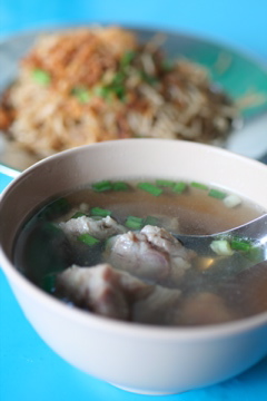 それから炒めビーフンとプーケット版バクテーのセット。プーケットではこの組み合わせが定着しているそうです。バクテーはポークリブを漢方薬入りのスープで煮込んだもので、シンガポールやマレーシアではおなじみの料理ですが、プーケットのものはよりあっさりでくせのないさっぱり味でしたが、とても美味しかったです。ただビーフンはブラウンシュガーも味付けに使われており、私には甘すぎるように感じました。プーケットに長年住めば、この味を美味しいと思うようになるのだろうなあ・・・。