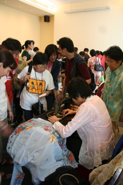 私はペナンのクバヤテイラーの友人にずっと付き添い(人手が足りず)、デモンストレーション会場の方にいましたが、そこでは、ペナンとクアラルンプールから来たクバヤテイラー2名の実演と、3人の女性によるビーズ刺繍実演会が催されていました。