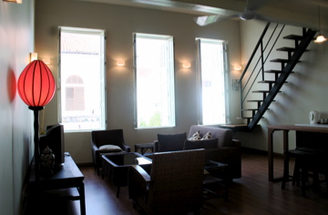 宿泊客のみが使用する階段を上ると、ショップハウスの中庭を挟んで通りに面した前方の部屋と、中庭を見下ろす後方の部屋に分かれます。
