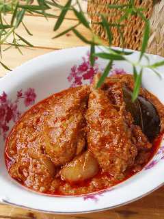 お次は、ペナンの名物とも言える「カリー・カピタン(エシャロット風味のチキン・カリー)、これも日本で味わえるお店はごくごく僅かです。一見激辛そうに見えますが、どっさり炒めたエシャロットやオニオンの甘味が特徴で、子供さんやお年寄りでも美味しくいただけるカリーです。マカンさんのカリー・カピタンのレシピは、ペナンに住むプラナカンの重鎮、ドクターNgご夫妻のレシピに基づくもので、たまねぎのコクと鶏の旨味の間からジワリと滲み出るスパイスの風味が後を引く逸品です。マカンさんでは必ずオーダーしたい料理のひとつです。