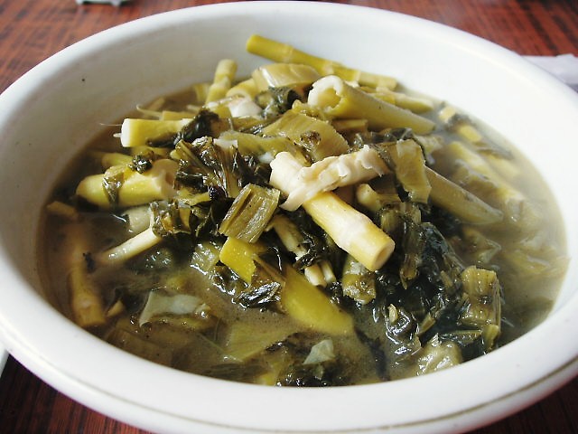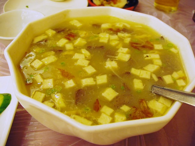 漬物は客家料理には欠かせないものですが、甘酸っぱい漬物と姫竹の子がどっさり!直径26センチほどの大きな器で出てきました。漬物の酸味と、しゃきっとした竹の子の舌触りが心地良く、最初は幾分酸味が強いかな~と思いながらも、食べ進むに連れ段々と病み付きになり、結局はほぼ完食。最初の料理にはもってこい、食欲増進の爽快感あふれる具だくさんスープでした。