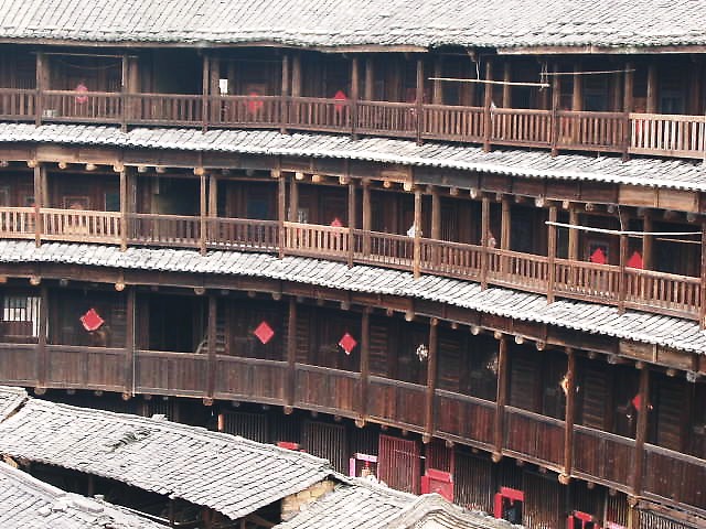 永定で最も有名な土楼のひとつ「振成楼」は、1912年に5年の歳月を経て建てられた直径51メートルほどの比較的新しい円楼です。時代の流れもあり、防災を配慮してか、石のレンガを木造建築の中に巧みに取り入れています。回廊や柱にはヨーロッパ風の装飾を模倣した細工が見られ、重厚な円楼の中にハイカラな雰囲気を漂わせているのが振成楼です。