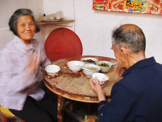中をのぞくと可愛らしい食堂で2人の老夫婦がおいしそうな昼食の最中でした。