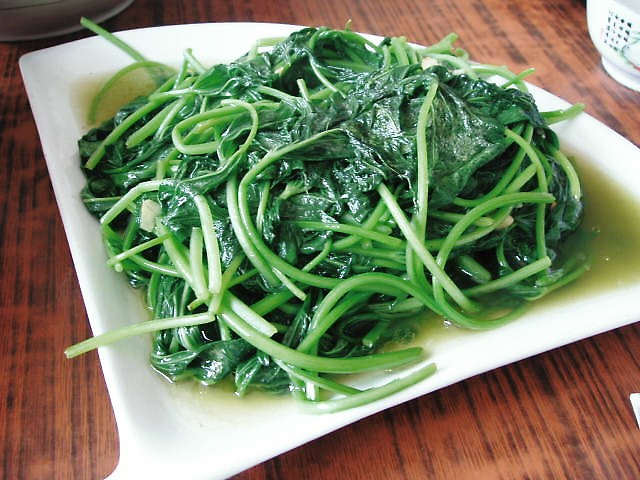 南部の葉っぱ炒めでは、空芯菜がポピュラーですが、私はこちら「さつまいもの葉」炒めのほうが好きですね。空芯菜のようにかすかなネバリがありますが、もっと優しく繊細な味がします。つぶしたニンニクとともに、青々と炒められてとても美味しそうでしょう! なんたってみんな地のものですから野菜の味の濃さもひとしおです。