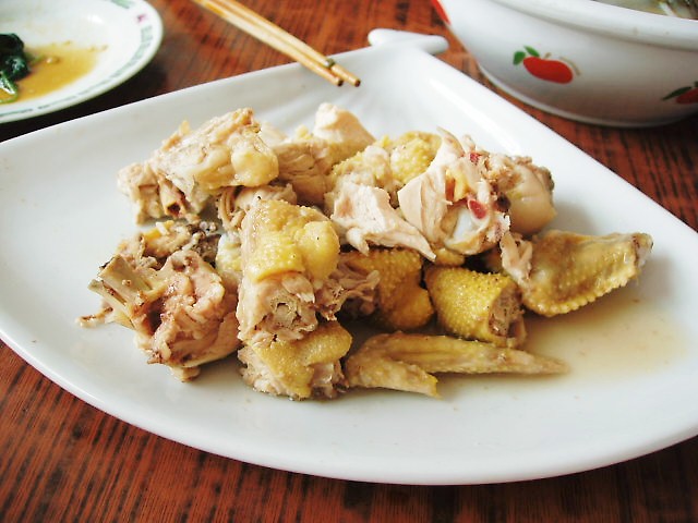 ただし、すくい上げるごとに鶏の首だの、やたらと逞しい爪先だのがにょきっと現れるので、一瞬ぎょっとしながらも、おいしいスープだけをひたすら口に運んでいました。煮込まれた鶏の身はニンニク醤油につけて食べてもいいですよ、と言われコクのあるお醤油につけて味わいました。