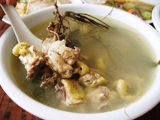 入っている薬草は、客家の人がスープには必ず入れるという干した木の枝(小さな葉っぱつき)ですが、名前を聞いてもチンプンカンプンで分かりませんでした。薬草と書きましたが、薬膳スープなどにある苦くていかにも薬、という味ではなく、まったく薬草を感じさせず、鶏の味をそのまま楽しむ実にナチュラルな味のスープでした。味付けはたぶん塩とほんの少しのお酒?のみ。鶏のエキスがぎゅっと濃縮されたスープはまさに絶品。
