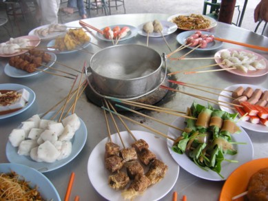 私たちはいつもヤム芋と梅干の奪い合いです。ヤム芋のトロミと上品な甘み、梅干のさわやかな酸味、魚系のダシ、と和食に似た郷愁をさそう鍋なのですが、つけダレがまさに潮州風。細かく刻んだニンニク入りの甘い酢などにつけて具を食べます。もちろんおいしいスープは一滴残さずたいらげます。日本のように、ここにご飯をいれておじやに、、、なんてのはなく、皆ごはんの上からスープをかけて食べています。人気のお店は鍋が出るまで1時間待ち、なんてのもあります。書いている今もまた、車を飛ばして食べに行きたくなりました。