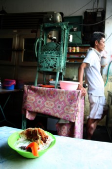 オンデオンデとは、餅のような皮の中にパームシュガーのシロップが包まれたもので、皮にはココナッツがまぶしてあります。今までシンガポールで食べてきたものは、ぼてっとした白玉団子のようなシロモノばかりでした。ひどい店(有名な高級ニョニャ料理店)では、黒蜜なしのものを平気で出し、こちらが日本人だと思って「本物のニョニャのオンデオンデはそういうもの」と開き直られたこともあります。ペナンでもいろいろ食べましたが、皮の出来はなかなかグッドなのですが、中のパームシュガーが固形のまま残っており、舌触りが悪いのです。そんな中、マラッカのこの店のものはもちっとしつつも弾力のある、薄手の皮の中に包まれたパームシュガーの黒蜜がとろ~り、とにかく抜群の美味しさなのです。
