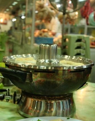 鍋の真ん中が煙突状にのび、(羊のしゃぶしゃぶ用鍋と似ています)中をのぞくと(本当は危険)赤々と燃える炭が入っており、お鍋の中はたえず熱々の状態。