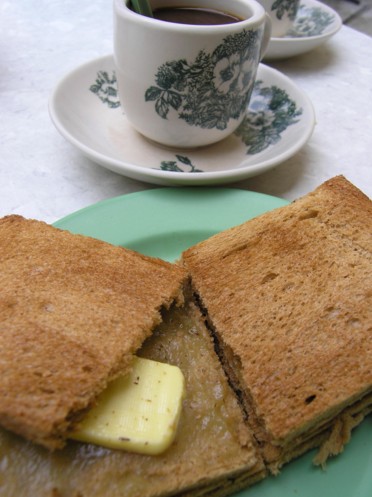 ハイナニーズのコピティアムでは茶色い食パン(黒パンやライ麦パンとは違います)を薄く切り、それを炭火でカリカリ・サクサクになるまで焼き、そこにマーガリンとカヤを塗って出します。最近はフレンチ・トーストにカヤを添えて出す店もありますが、是非サクサク・サンドを味わってみましょう。そういえば、ペナンのハイナニーズのコピティアムでとってもユニークな、ピーナッツの粉にまみれたとっても分厚いトーストを食べたことがあります。この手の店にしては値段も結構立派でしたが、とてもおいしかった。こういうものを作り出す才能が海南人たちにはありますね。