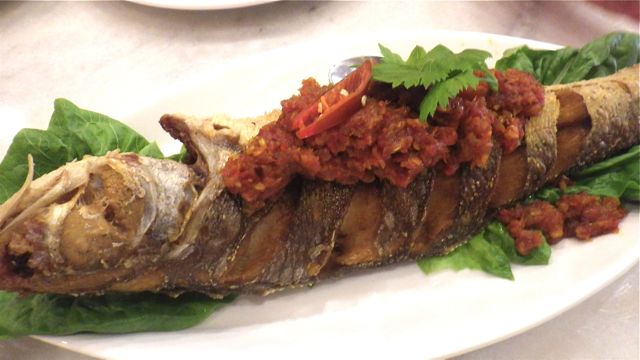 8月の講演会でも「私が一番好きな料理」と申し上げたお料理でございます。魚は新鮮なスナンギンという美味しい白身魚で、カリッと揚がっており、これだけでも同行者は美味しいと感動していましたが、私はなんといっても、上にかかっているサンバル。フレッシュな唐辛子とシャロットをつぶしてペーストにし、じっくりと油で炒めて塩で味付けしただけのシンプルなサンバルですが、私はこれだけでごはんが食べられるほど気に入っています。ジョイスも「そう、これだけでもいいくらい!」と笑っていました。