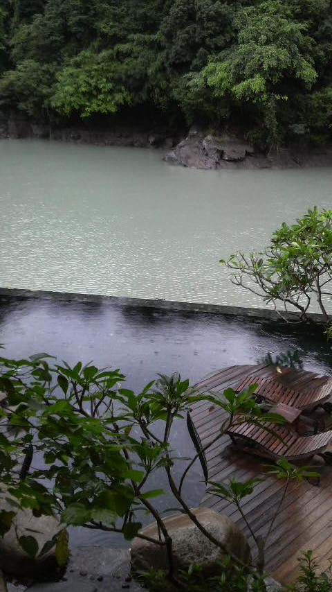 このプールは、ちょうど目線が渓谷を流れる川と緑と一体化し、まるで湖の真ん中にプカ~っと浮いているかのような錯覚に陥る流行りのインフィニティ・プール。深淵たる山の生気を思い切り吸い込み、いつまでも浮かんでいたくなる素晴らしいプールでした。生憎、台風の影響で雨が降りしきり、普段は湖のように静かなエメラルド色の川だそうですが、この日は写真のとおり。それでも充分満喫できました。