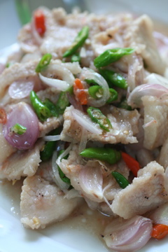 これはオキアミの塩漬けにプリッキーヌー、ニンニク、エシャロット、ライムなどを加えた爽やかでスパイシーなタレ。これに例の野草をつけて食べるのです。う−ん、野草を味わうにはまだまだ修行が必要ですが、タイの野菜って新鮮でおいしいんですよね。とくにキュウリとトマトはシンガポールから来た私たちには非常に美味しく感じました。