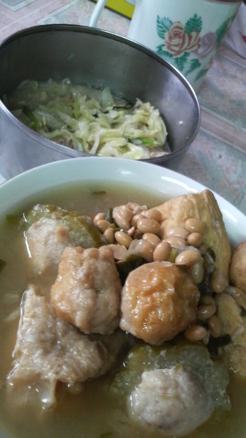 具は厚揚げや湯葉、ビターゴーというゴーヤに似た野菜、それぞれの中に丁寧に豚のミンチが詰め込んであります。そして残った豚肉で作ったミートボール。