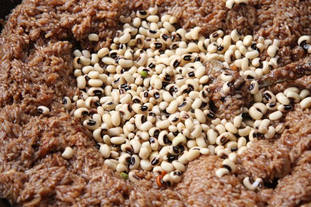肉を煮ている間におばさんは餅米の準備に。干しエビとニンニクを炒めたところに餅米を加えてしばらく炒めます。